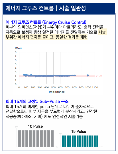 매 샷 마다 피부의 저항값을 계산하여 최적의 고주파에너지를 방출할 수 있습니다.